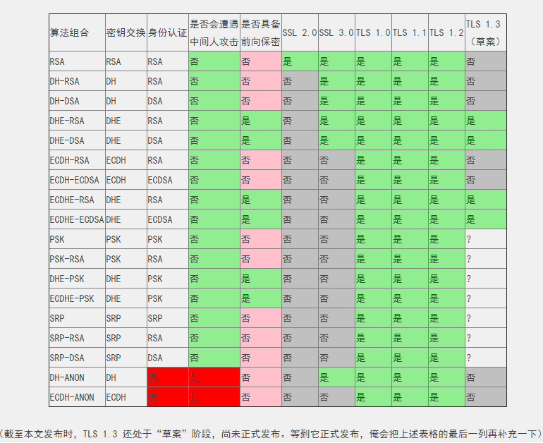 最原始的DH算法并不能对抗中间人攻击,一般要配合签名技术,不配合签名技术的DH称为DH-ANON,配合RSA签名的称为DH-RSA,配合DSA签名的称为DH-DSA,配合ECDSA签名的称为DH-ECDSA。