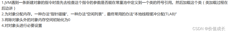 5) 内存分配完成后, 虚拟机需要将分配到的内存空间都初始化为零值,保证了对象的实例字段在Java代码中可以不赋初始值就直接使用