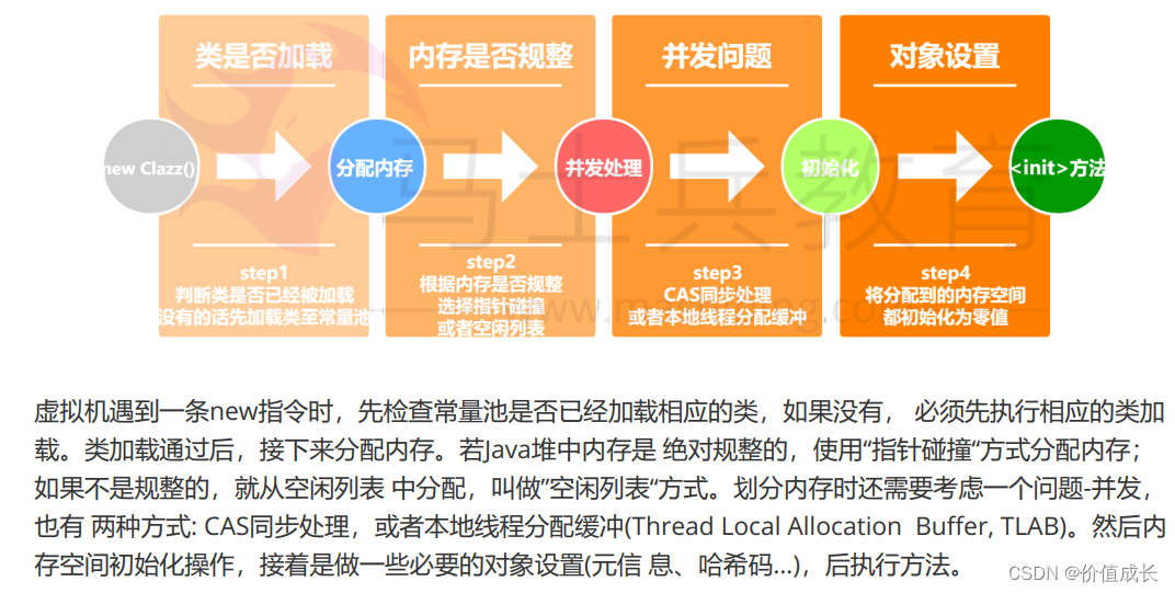 6) 虚拟机要对对象进行必要的设置,主要是对象头中的信息,包括:对象是哪个类的实例、 如何才能找到类的元数据信息、 对象的哈希码、 对象的GC分代年龄、是否启用偏向锁