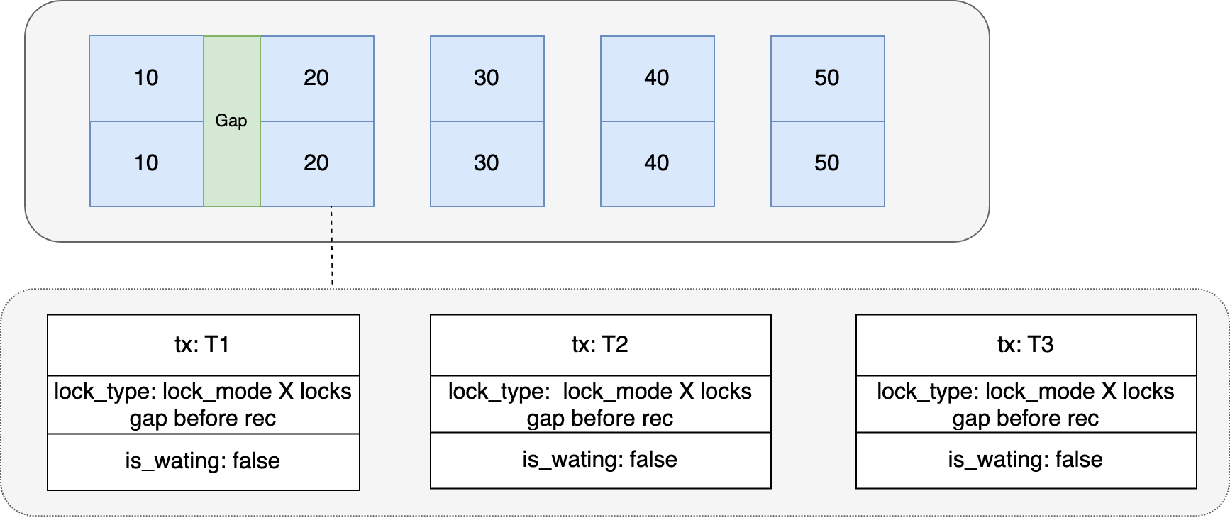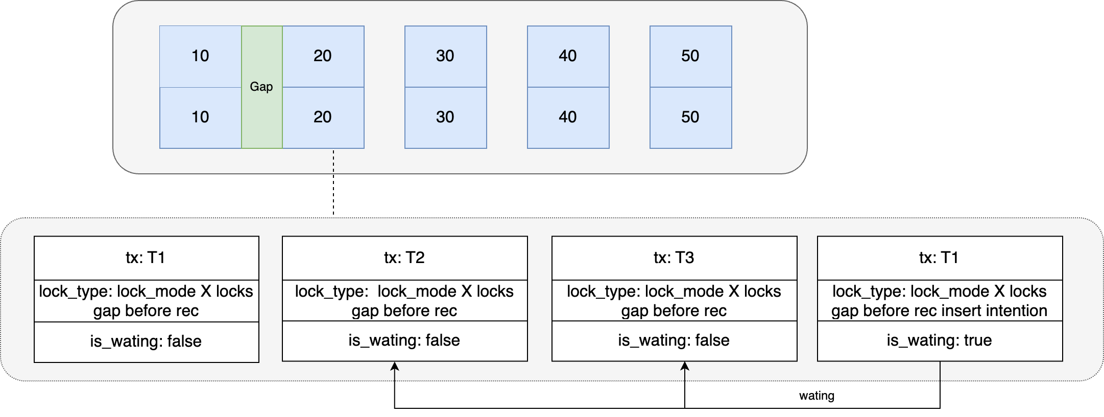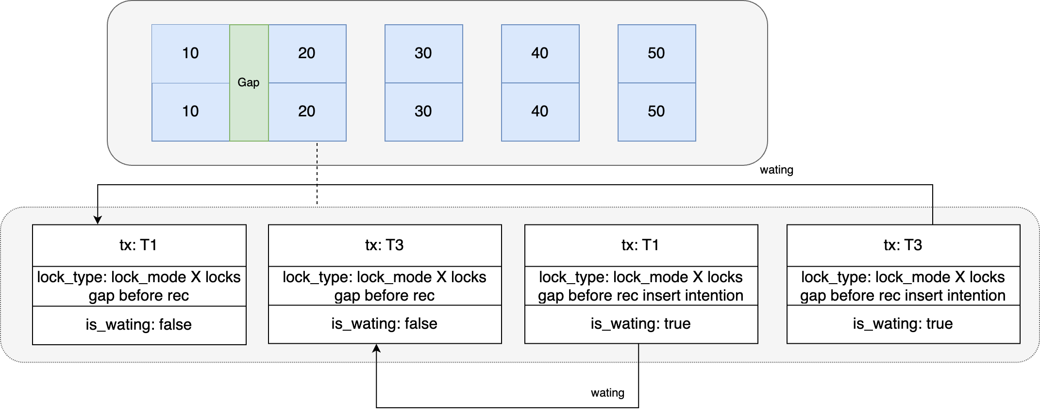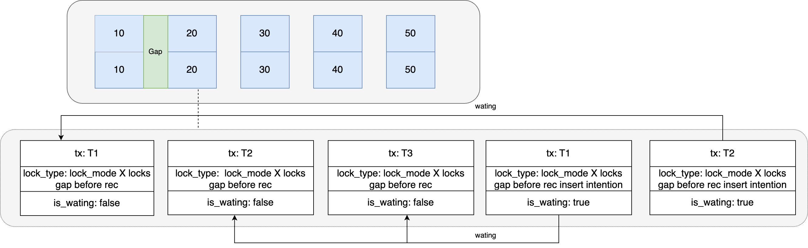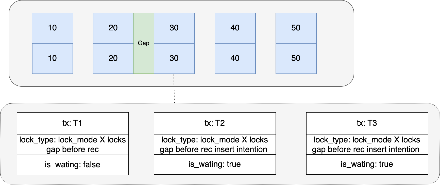 此时 session 2 和 session 3 都在 id = 30 的记录上添加了插入意向锁等待 session 1 上的 Gap Locks 释放,生成的锁记录如下: