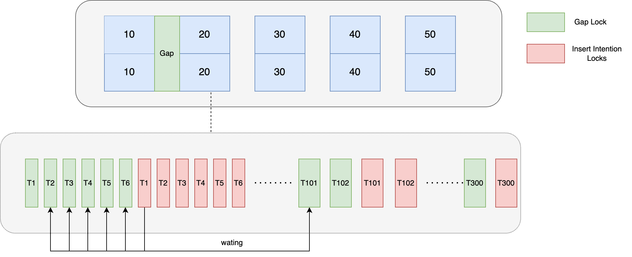从图中可以看到当 T1 在执行插入语句时,需要等待 T2- T101 上持有的 Gap Locks 释放,之后 T2 - T6 可能同时执行插入语句,然后进行死锁检测,事务回滚,看着似乎只要后续有事务执行了插入语句就会执行死锁回滚,正常运行,但在死锁检测的过程中还会有新事务(T101 - T 200 )获取到 Gap Locks,造成锁等待队列中的事务越来越多,而 Mysql 的整体死锁检测时间复杂度为 O(n^2),锁等待队列中的事务较多时,每一次有新事务进行锁等待,死锁检测都需要遍历锁等待队列中在其之前等待的事务,判断是否会因自己的加入形成环,此时检测会非常消耗 CPU 资源,造成数据库整体性能下降,死锁检测耗时增加,Mysql 活跃连接数大幅增加,并且因锁等待而连接无法释放,最终造成应用层连接池被打满