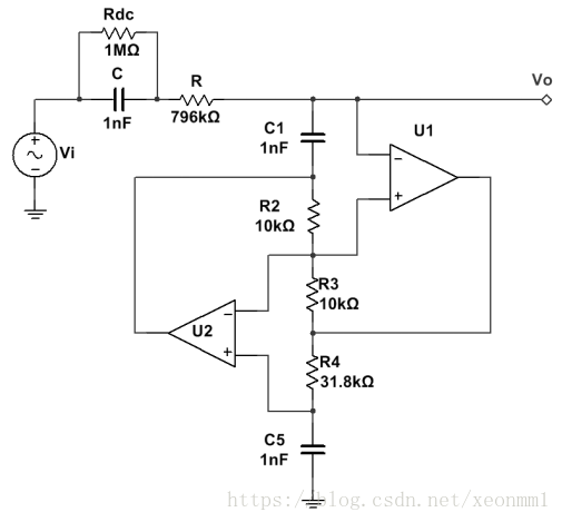 为提供运放直流通路,可在输入端电容C并联一1M阻值电阻,在输出端电容C’处并联一电阻使直流增益为0.5。为了减少负载效应,还应该串联一电压跟随器。