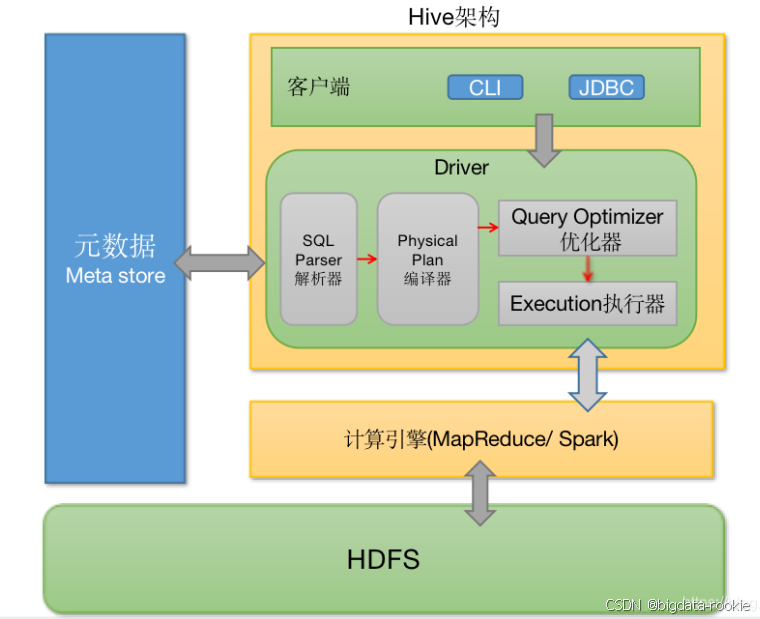 驱动程序,包括语法解析器、计划编译器、优化器、执行器。完成 HQL 查询语句从词法分析、语法分析、编译、优化以及查询计划的生成。生成的查询计划存储在 HDFS 中,并在随后有执行引擎调用执行;