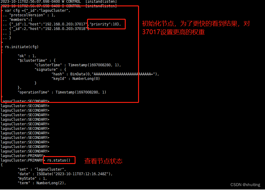 7. 初始化节点配置,进入任意一个节点比如37017节点运行如下命令: