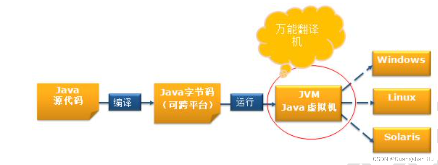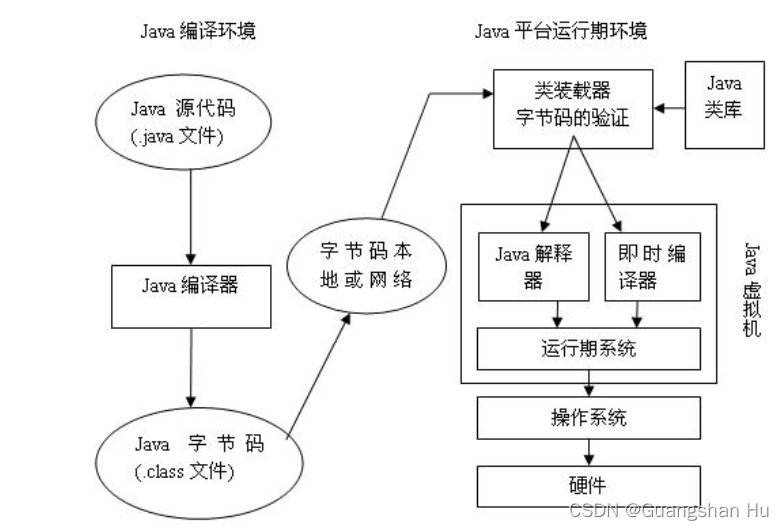 - 它有一个解释器组件,可以实现Java字节码和计算机操作系统之间的通信