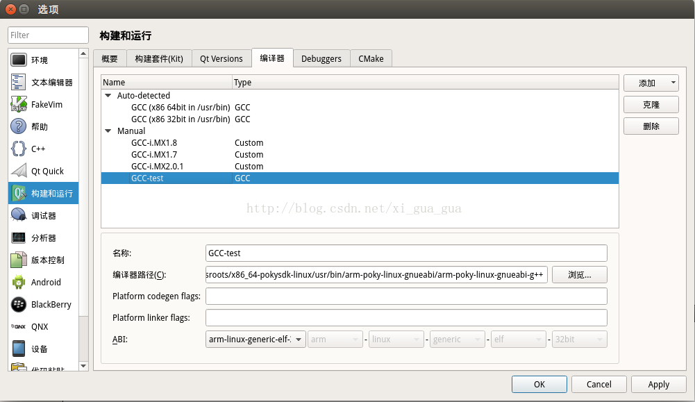 想要使用GCC、MinGW、Clang或QCC构建一个应用程序,首先指定路径到编译器所在的目录中,然后从可用版本的列表中选择应用程序二进制接口(ABI)的版本。你还可以创建一个自定义的ABI定义。对于QCC来说,还需指定路径到QNX Software Development Platform (SDP)中。
