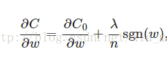 上式中sgn(w)表示w的符号。那么权重w的更新规则为:比原始的更新规则多出了η * λ * sgn(w)/n这一项。当w为正时,更新后的w变小。当w为负时,更新后的w变大——因此它的效果就是让w往0靠,使网络中的权重尽可能为0,也就相当于减小了网络复杂度,防止过拟合。