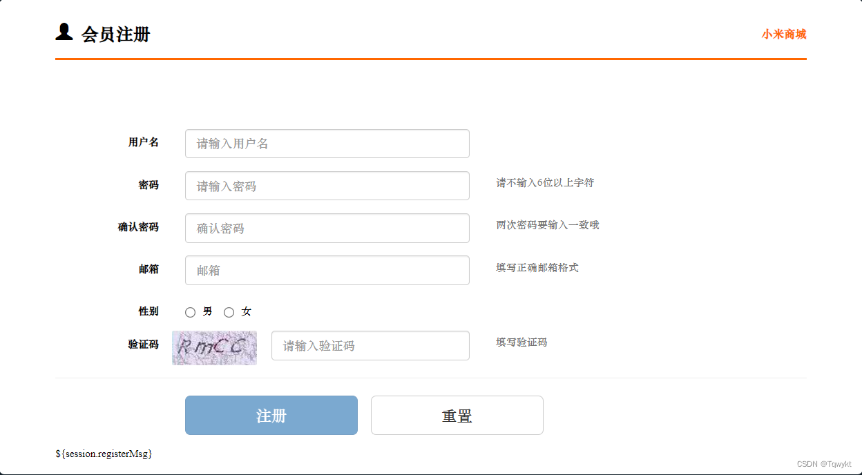 JavaWeb-仿小米商城(2) 用户注册 目录1、业务描述2 业务分析2.1 业务流程抽象2.2 可能的技术难点与解决策略3 代码实现3.1 信息验证与提交3.1.1 用户名校验的前端代码3.1.2 用户名校验的Servlet代码3.1.3 Service3.1.4 Dao3.2 邮件激活3.2.1 Servlet3.2.2 Service3.2.3 Dao1、业务描述注册业务旨在收集和管理用户的个人信息,是未来提供个性化服务的基础。相应的前端页面如下方静态H5页面图所示: