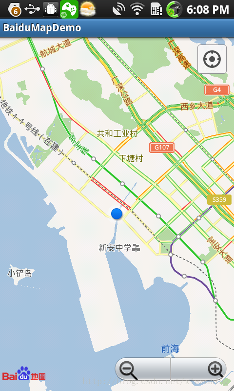 二 . 布局文件,一个百度地图控件,加一个手动点击实现定位的按钮,放在一个相对布局里面,很简单的布局