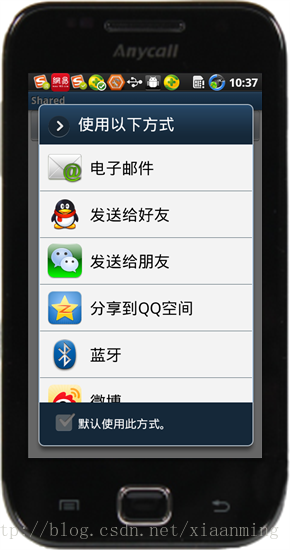 假如你安装了过滤Action为ACTION_SEND,MIMEtype为“text/plain”的应用程序,这个系统就会启动,假如系统匹配到多个这样子的应用程序,他就会弹出一个Dialog列出所有的应用供用户选择(一个选择器),如下图