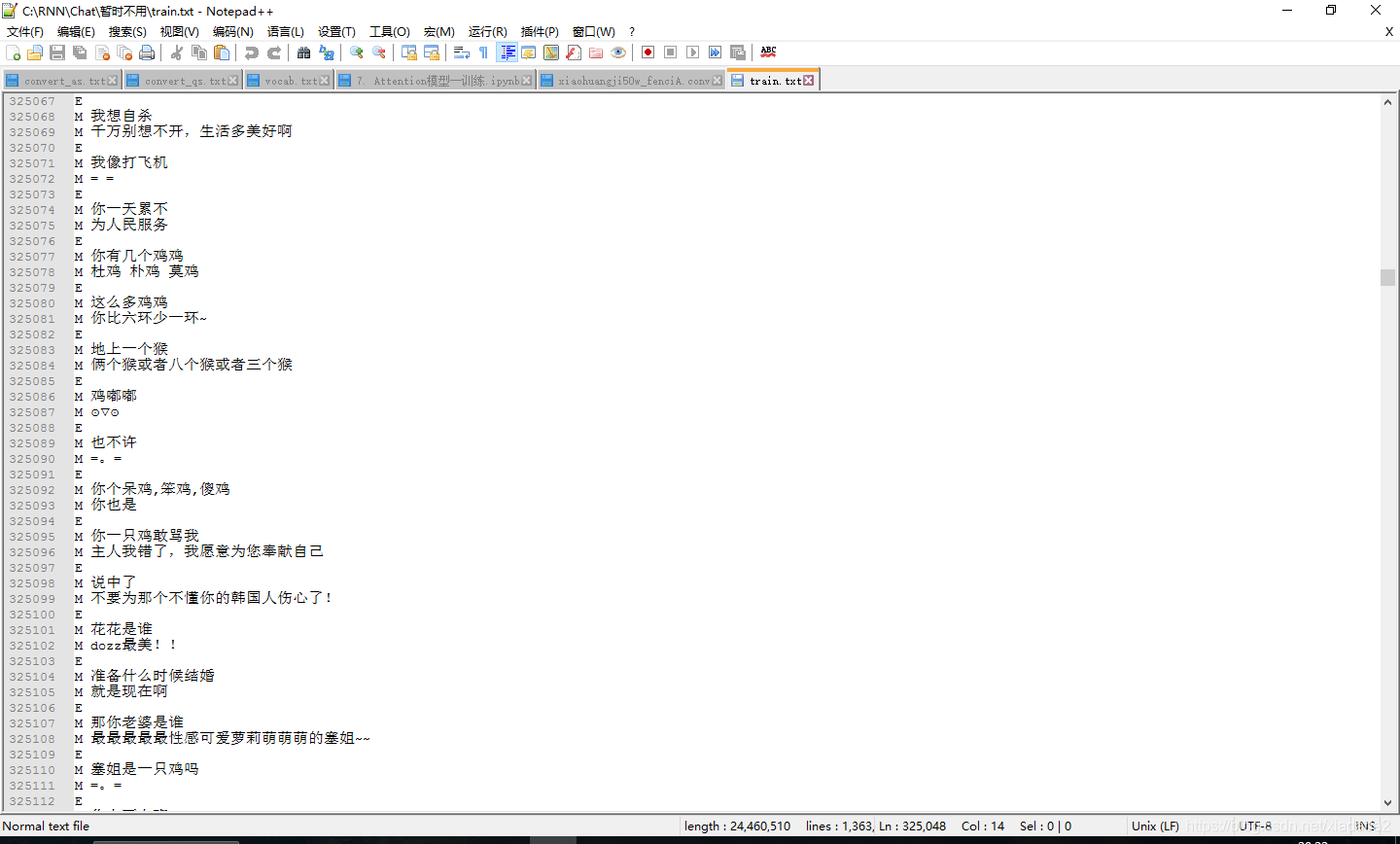 with codecs.open('C://RNN//Chat//train.txt','r','utf-8') as f: