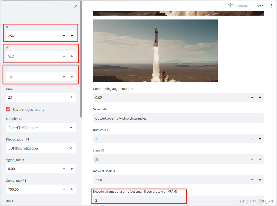 上传图片后,调整参数,下面三个红框分别为视频的高、宽、要生成的总帧数和一次处理多少帧,如果显存小的话可以改小这些参数。点“sample”等待就可以看到结果了。