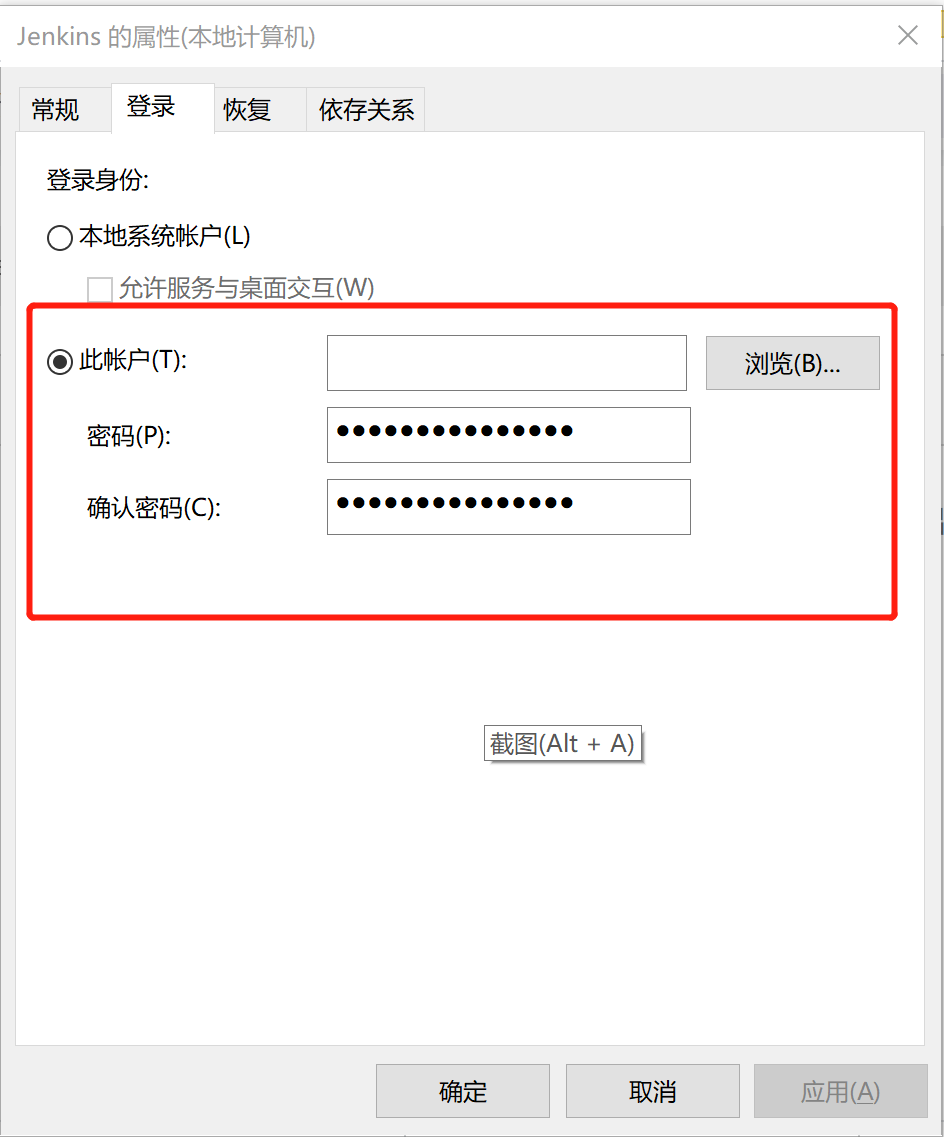切换登录标签,选中此账户登录,里边填写administrator或者有权限的账户,密码就是登录密码,此时重启jenkins服务即可