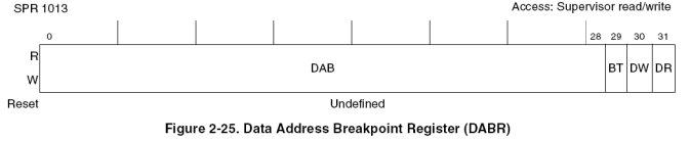 DABR寄存器控制着数据断点的功能,该功能对PowerPC构架来说是可选的,但是PowerPC 构架推荐执行该功能,但是并不是必须的。