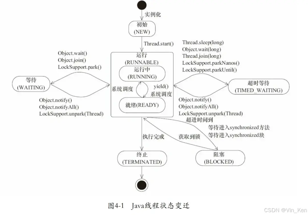 | READY \ RUNNABLE | 就绪状态(调用start,等待调度)+正在运行 |
