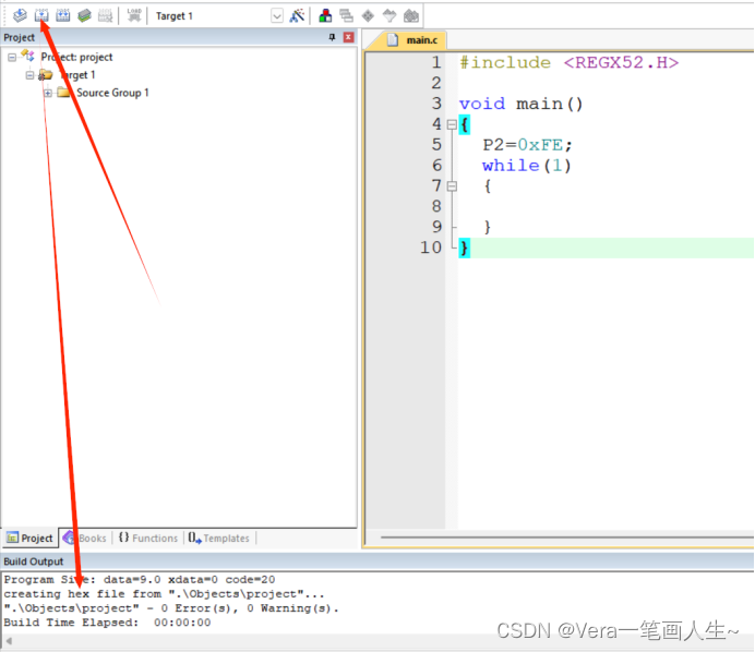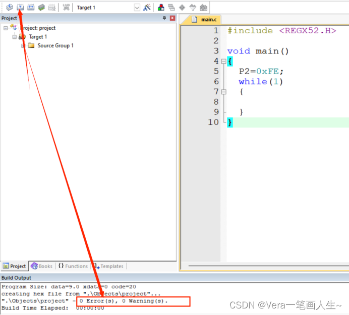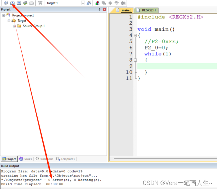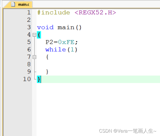 我们可以先把P2=0xFE注释掉,然后写成P2_0=0;就可以只操作P2的其中一个口了,而这个口是0口,所以写成P2_0