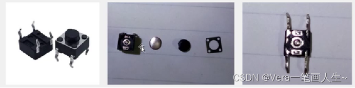 它相当于一种电子开关,按下时开关接通,松开时开关断开,实现原理是通过轻触按键内部的金属弹片受力弹动来实现接通和断开。
