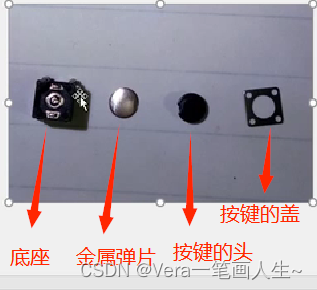 不管按键有没有按下,左边两个引脚都通过一个金属片连接起来,然后再向中间伸出两个接触点,右边两个引脚也是通过一个金属片连接起来,并向中间伸出一个接触点,如上图红色标识。