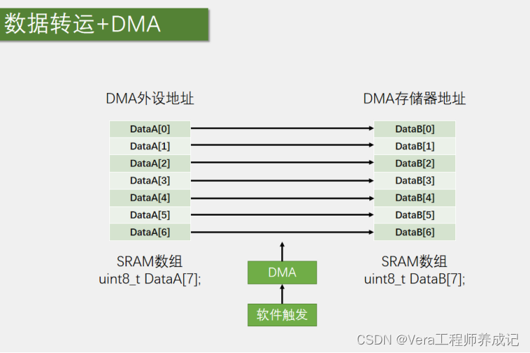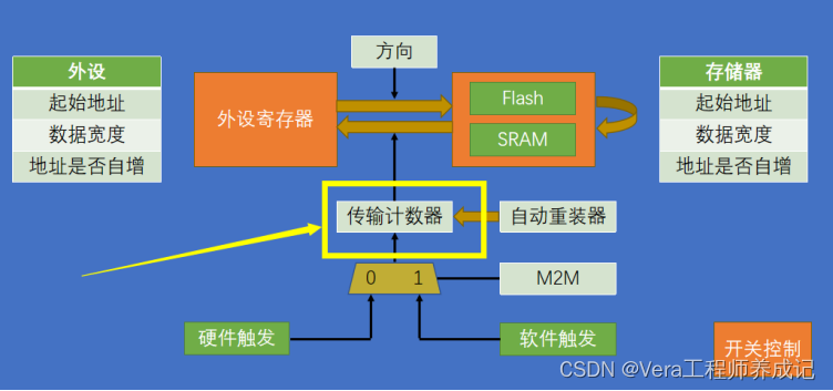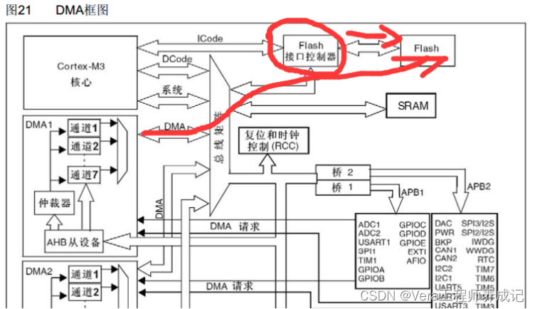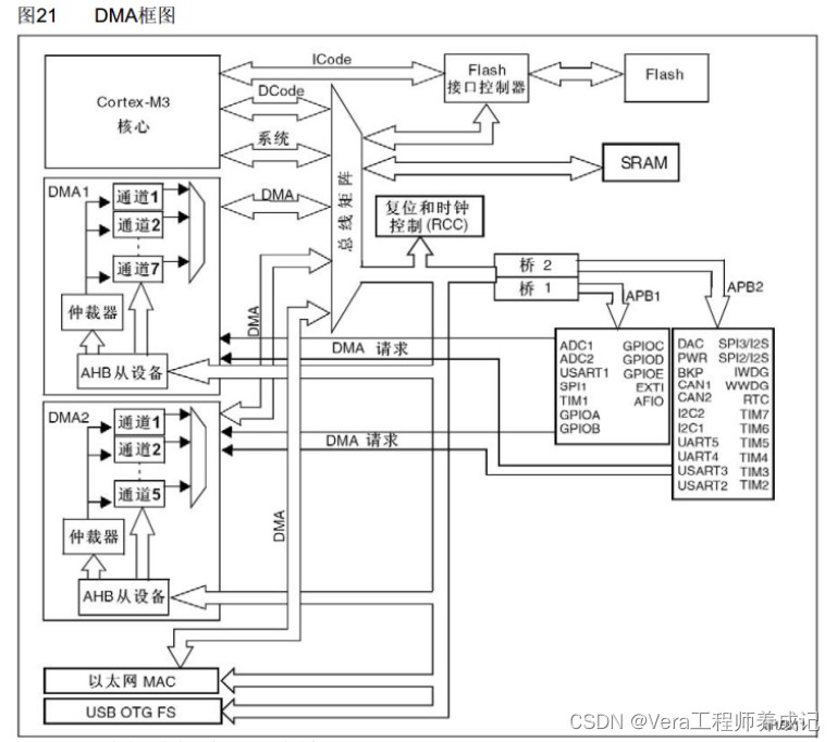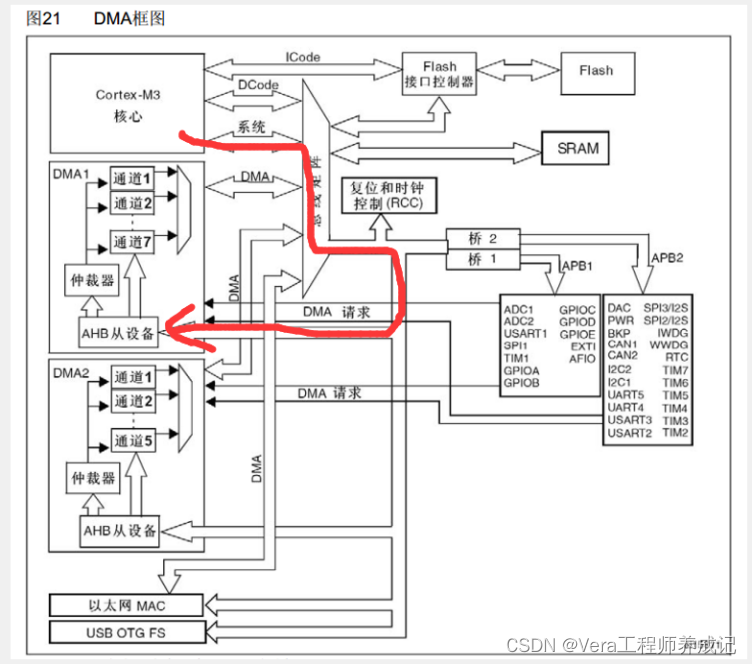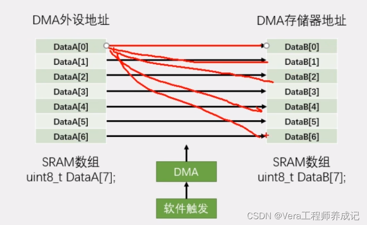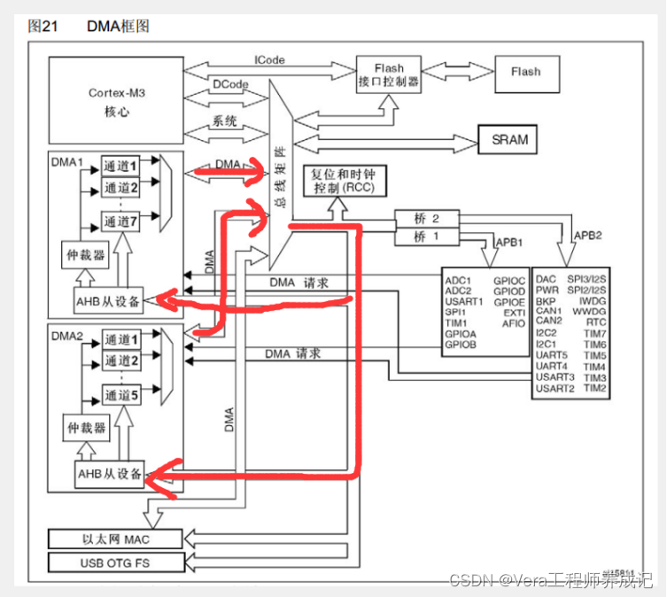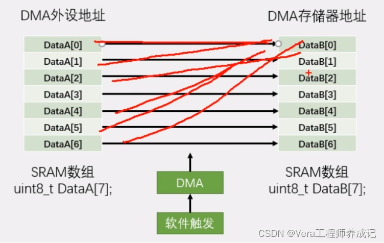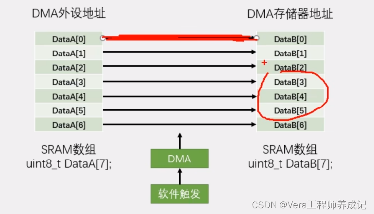 看图中的箭头方向就知道DMA的数据转运可以是从外设到存储器,也是可以从存储器到外设,具体是向左还是向右,有一个方向的参数可以进行控制。