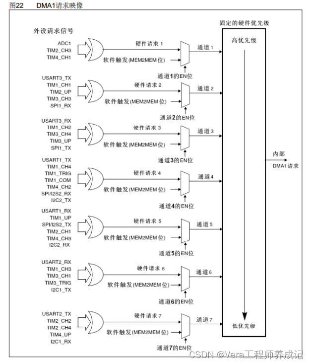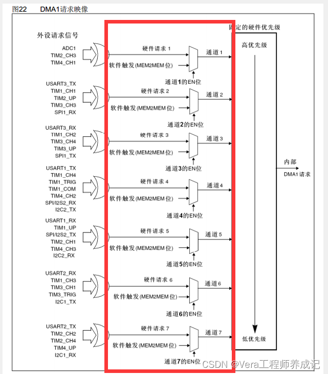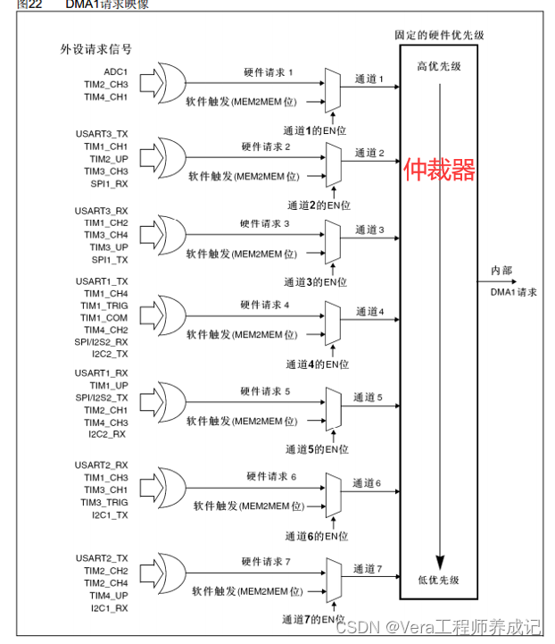 七个触发源进入到仲裁器,经优先级判断,最终产生内部的DMA1请求。这个优先级的判断,类似于中断的优先级,默认优先级是通道号越小,优先级越高。当然也可以在程序中配置优先级,这个其实影响并不是很大,大家了解一下就行了。