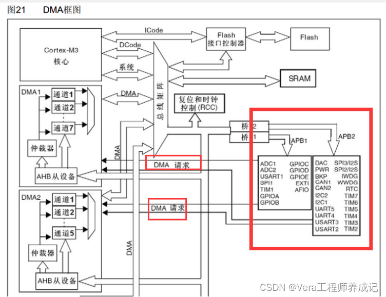 接着继续看,这里是DMA请求,请求就是触发的意思。这条线路右边的触发源是各个外设,所以这个DMA请求就是DMA的硬件触发源。