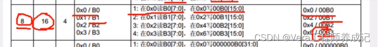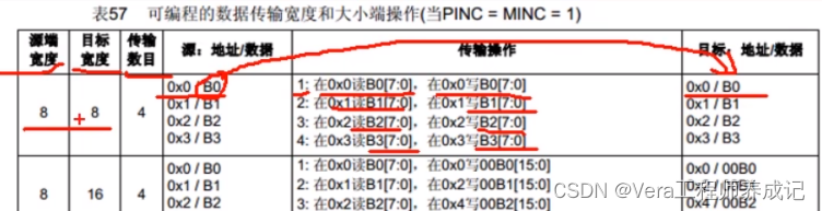 当源端和目标宽度都是八位时,转运第一步是在源端的0位置读数据B0,在目标的零位置写数据B0,就是把这个B0从左边挪到右边。之后的步骤就是把B1从左边挪到右边,接着B2,B3,这是源端和目标都是八位的情况。