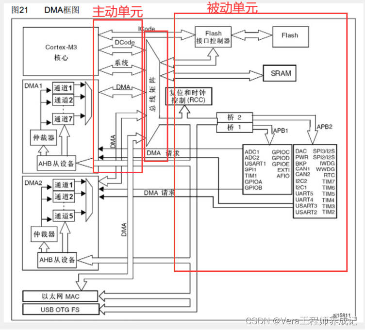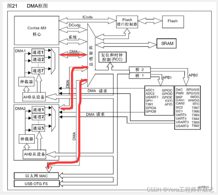 另外,由于DMA要转运数据,所以DMA也必须要有访问的主动权。那主动单元除了内核CPU,剩下的就是DMA总线了。这里DMA1有一条DMA总线,DMA2也有一条DMA总线。下面还有一条是以太网外设自己私有的DMA总线,这个可以不用管。