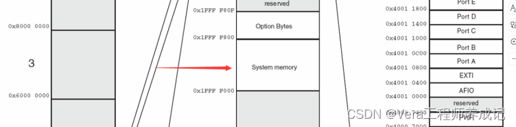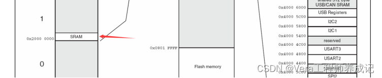 接着下面两块系统存储器和选项字节,这两块存储器也是ROM的一种,掉电不丢失。实际上它们的存储介质也是flash,只不过是我们一般说flash指的是主闪存flash,而不是指系统存储器和选项字节。它们的地址都是0x1FFF开头的,紧跟着0x2000开头的就是RAM区。