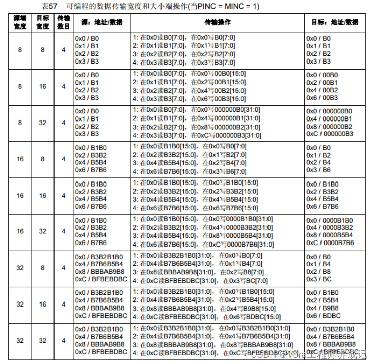在STM32手册里所说的存储器,一般是特指flash和SRAM,不包含外设寄存器。外设寄存器一般直接被称作外设,所以就是外设到存储器,存储器到存储器这样来描述。虽然我们刚才说了,寄存器也是存储器的一种,但是STM32还是使用了外设和存储器来作为区分,注意一下描述方法的不同。
