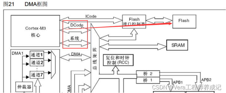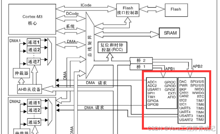 图中这两部分就是数据转运的两大站点,左边是外设寄存器站点,右边是存储器站点包括flash和SRAM。