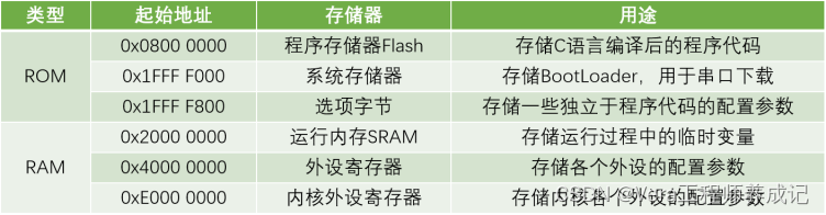 所以计算机的核心关键部分就是CPU和存储器。存储器又有两个重要知识点,一个是存储器的内容,另一个就是存储器的地址。那STM32也不例外,这个表就是STM32中所有类型的存储器和它们所被安排的地址。