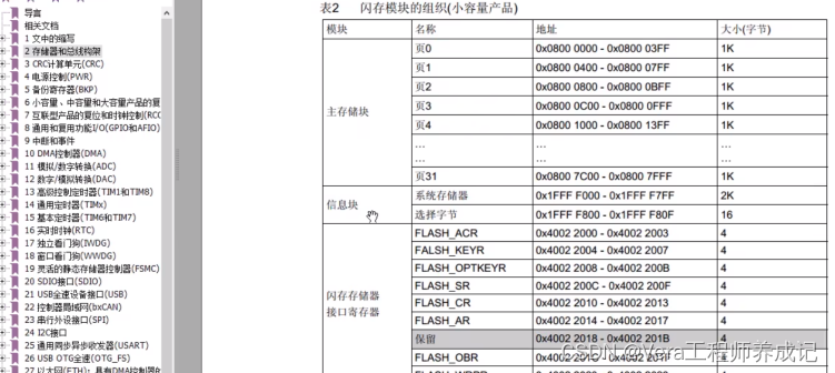闪存被分为了很多页,它们的地址都是0800开头的。在闪存区的最后就是系统存储器和选项字节,这两个区域统称为信息块。下面这是闪存接口寄存器,这是外设的一部分,这个外设可以对闪存进行读写。