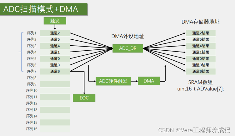 左边是ADC扫描模式的执行流程,在这里有七个通道,触发一次后七个通道依次进行AD转换,然后转换结果都放到ADC_DR数据寄存器里面。