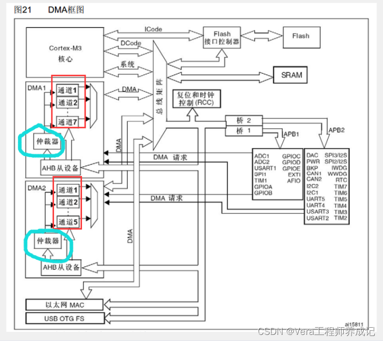 接着下面这里有个仲裁器。这个是因为虽然多个通道可以独立转运数据,但是最终DMA总线只有一条。所以所有的通道都只能分时复用这一条DMA总线,如果产生了冲突,那就会由仲裁器根据通道的优先级决定谁先用谁后用。