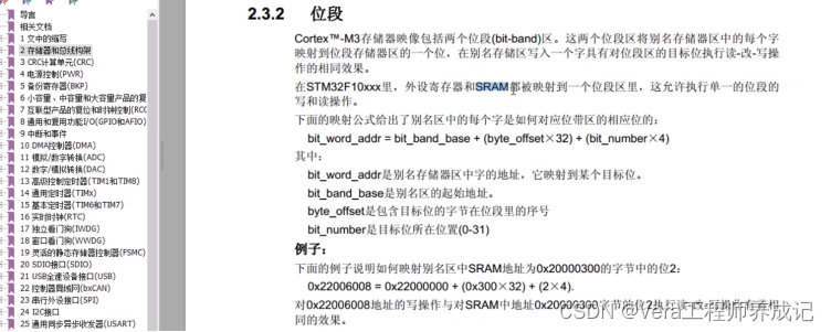 存储器包含两个位段区域,这两个位段区映射的外设寄存器和SRAM中全部的位。这个位段区就相当于是位寻址,它把外设寄存器和SRAM中所有的位都分配了地址,你操作这个新的地址就相当于操作其中某一个位。因为32位的地址有99%都是空的,所以地址空间很充足,即使把每一位都单独编码,那也毫无压力。所以就存在了这样一个位段,用于单独操作寄存器或SRAM的某一位,位段区是另早那一个地方开辟了一段地址区域。其中SRAM位段区是2200开头的区域,外设寄存器的位段区是4200开头的区域。