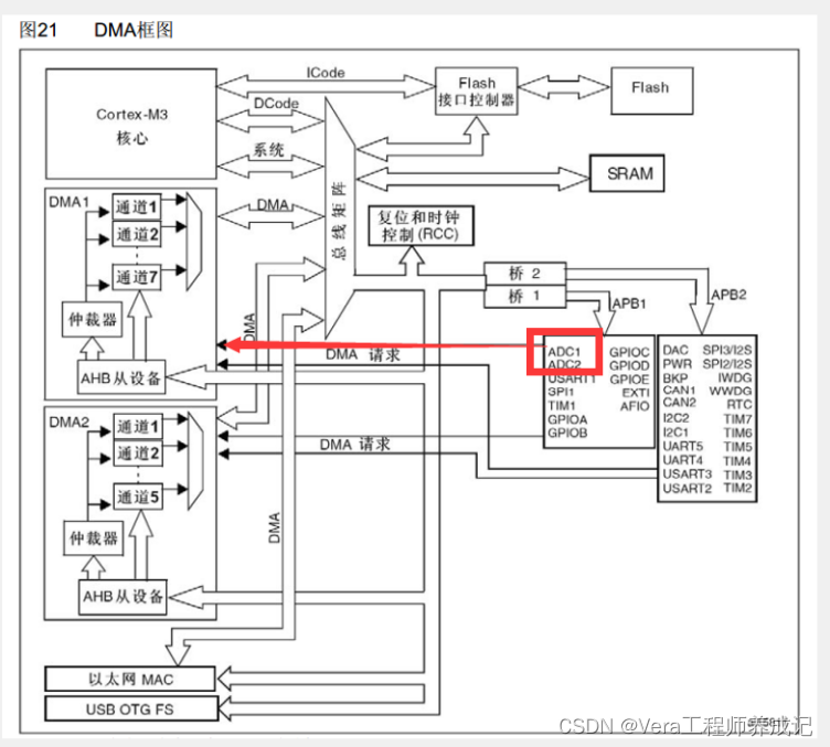 比如ADC转换完成,串口接收到数据,需要触发DMA转运数据的时候,就会通过这条线路向DMA发出硬件触发信号。之后DMA就可以执行数据转运的工作了,这就是DMA请求的作用。