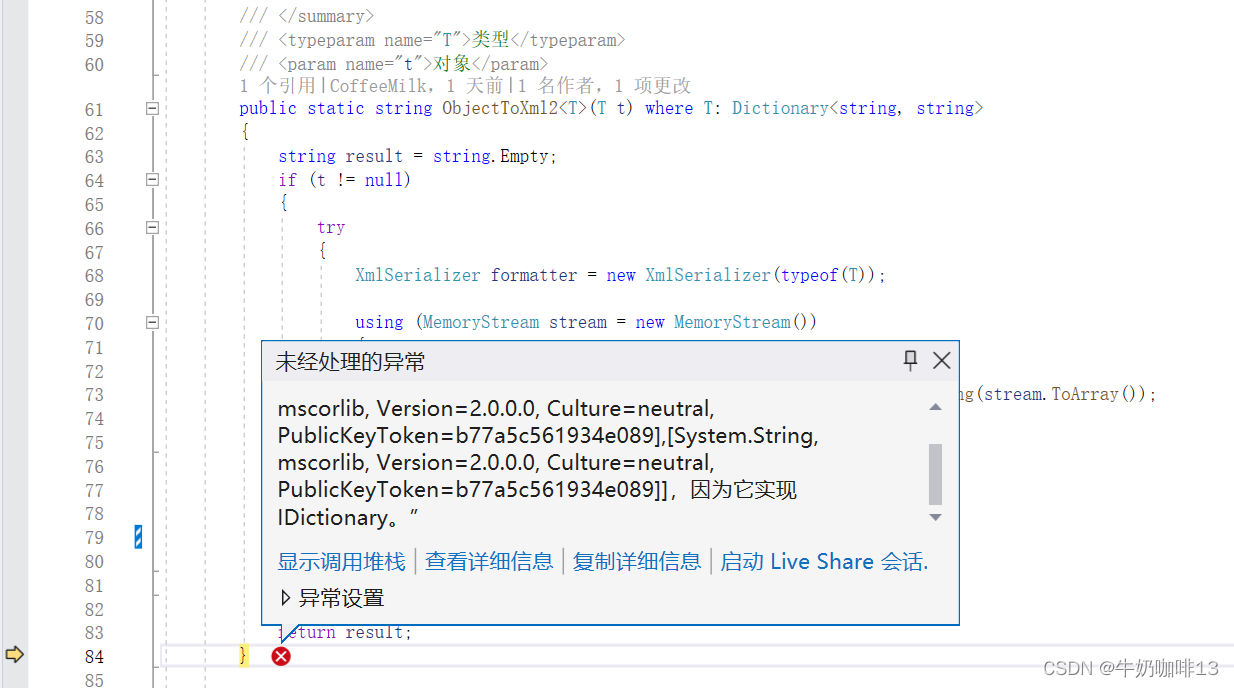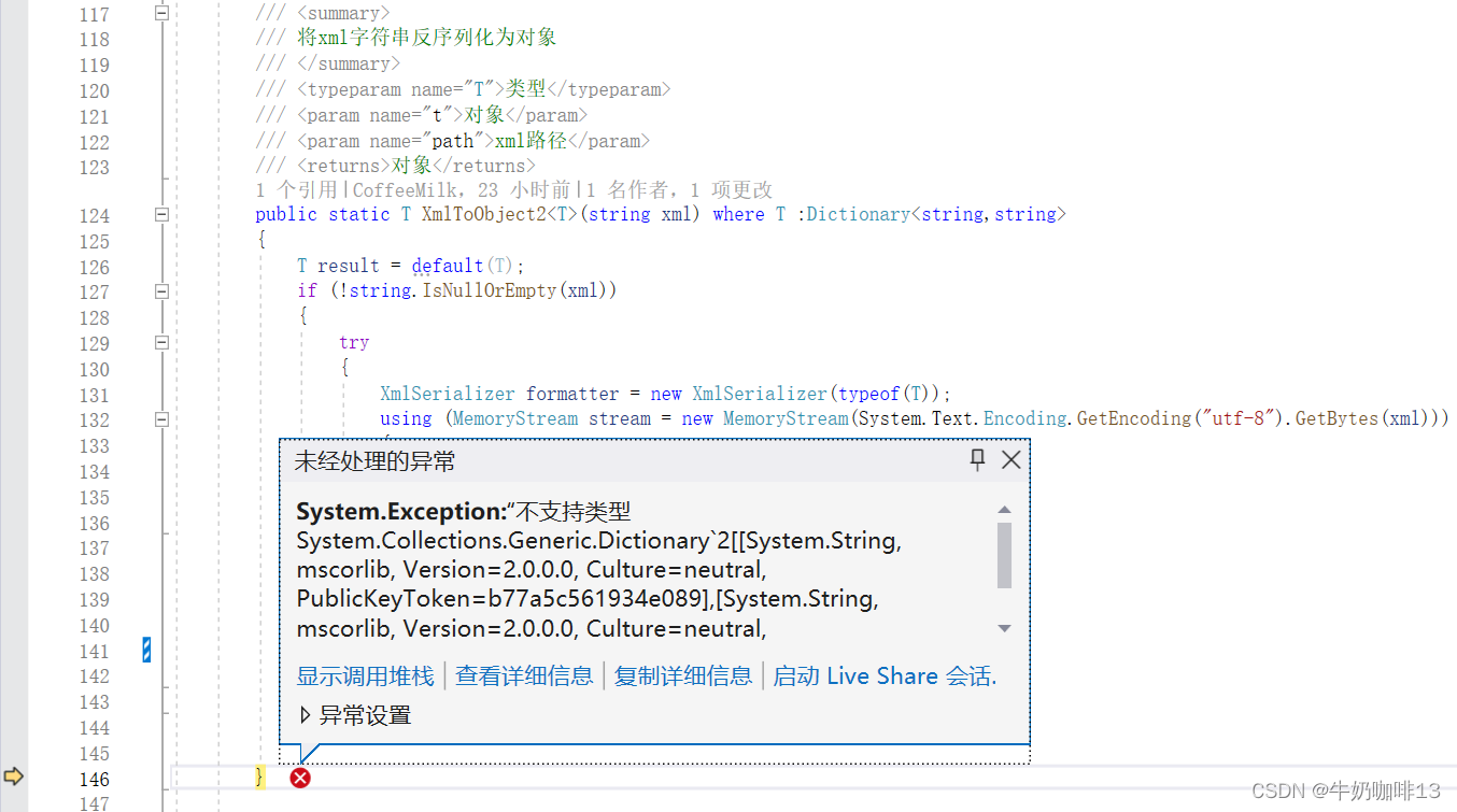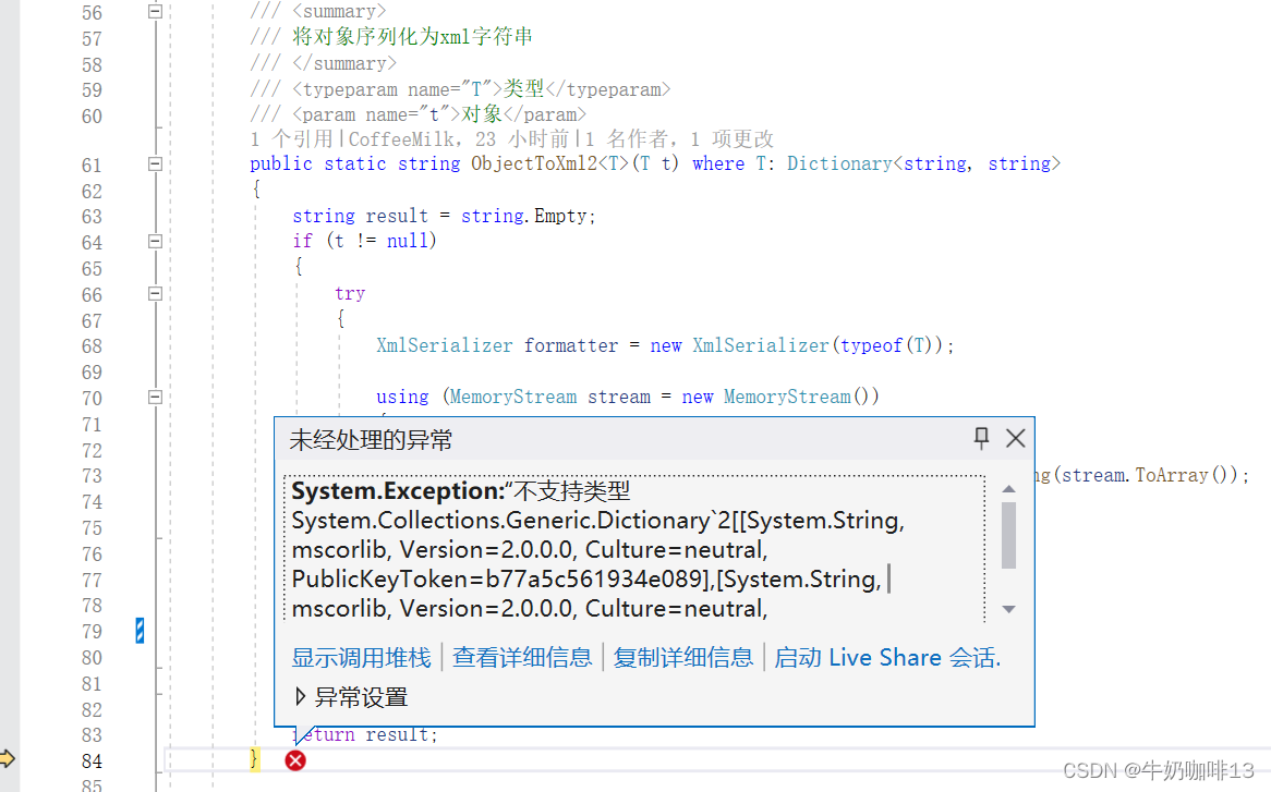 在使用C#对字典容器Dictionary<TKey, TValue>内容进行XML序列化报错【System.Exception:“不支持类型 System.Collections.Generic.Dictionary`2[[System.String, mscorlib, Version=2.0.0.0, Culture=neutral, PublicKeyToken=b77a5c561934e089],[System.String, mscorlib, Version=2.0.0.0, Culture=neutral, PublicKeyToken=b77a5c561934e089]],因为它实现 IDictionary。”】如下所示: