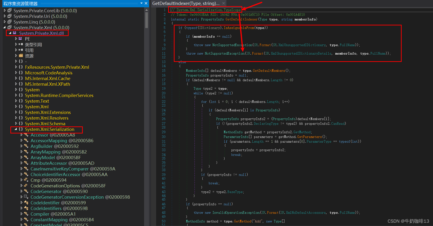 通过异常信息可以看到是由于XML序列化或反序列化程序导致报错,且该错误是由于IDictionary导致,通过反编译查看【System.Xml.Serialization.TypeScope】内容可以发现代码直接对IDictionary类型直接做返回异常处理,不让序列化或反序列化。