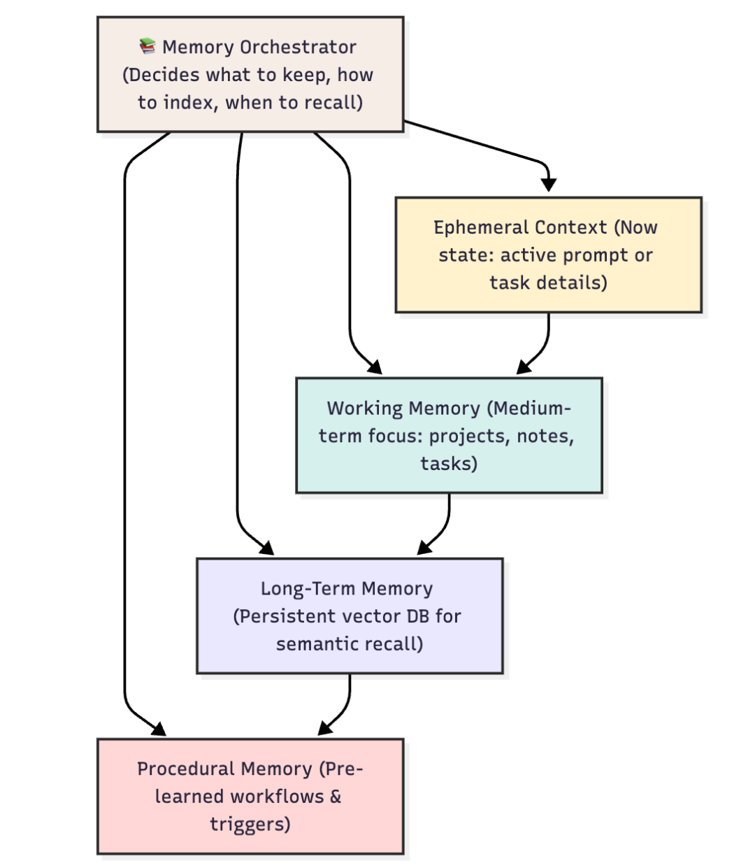 如果 AI 内核是脑干,那么多层内存系统就是海马体、皮层和工作记忆的结合体。它超越了人类操作系统内存模型的 RAM → 磁盘 → 缓存。相反,它在语义层面上运行: