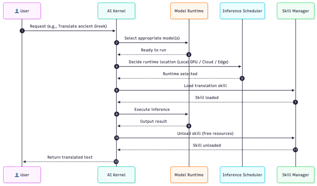 AI 操作系统的核心是其 AI 内核,它不仅仅是像 Linux 或 Windows 那样的 CPU 周期和内存分配的交通警察,而是推理的首席指挥官。它不只是说“运行这个程序”,而是说“运行这个思维链,引入合适的模型,并使它们协同工作”。