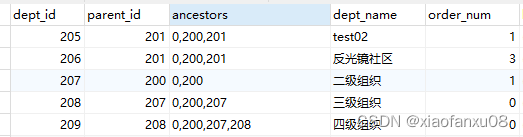 比如下面这张sys_dept表,ancestors表示该组织的所有上级组织,需要把这些上级组织全部用中文+‘-’的形式串联起来。