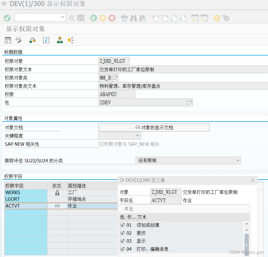 在ECC升级到S4的过程中,库位结构从单一库位变为工厂+库位的组合。这要求ZJHD打印机权限增加工厂字段。然而,尝试在SU21中修改权限对象ZJHD_LGO时遇到‘已交付’的限制,SAP建议过时原对象并创建新的。因此,需要使用SU20创建一个新的权限对象来适应这一变化。