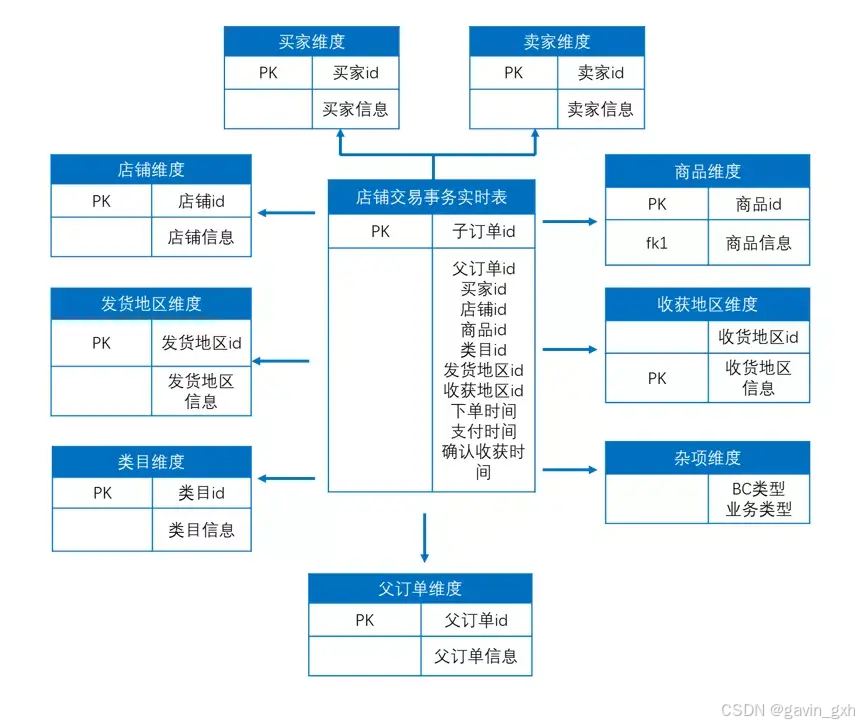 交易的过程分为:创建订单、买家付款、卖家发货、买家确认收货,即下单、支付、发货和成功完结四个业务过程。Kimball维度建模理论认为,为了便于进行独立的分析研究,应该为每一个业务过程建立一个事实表。