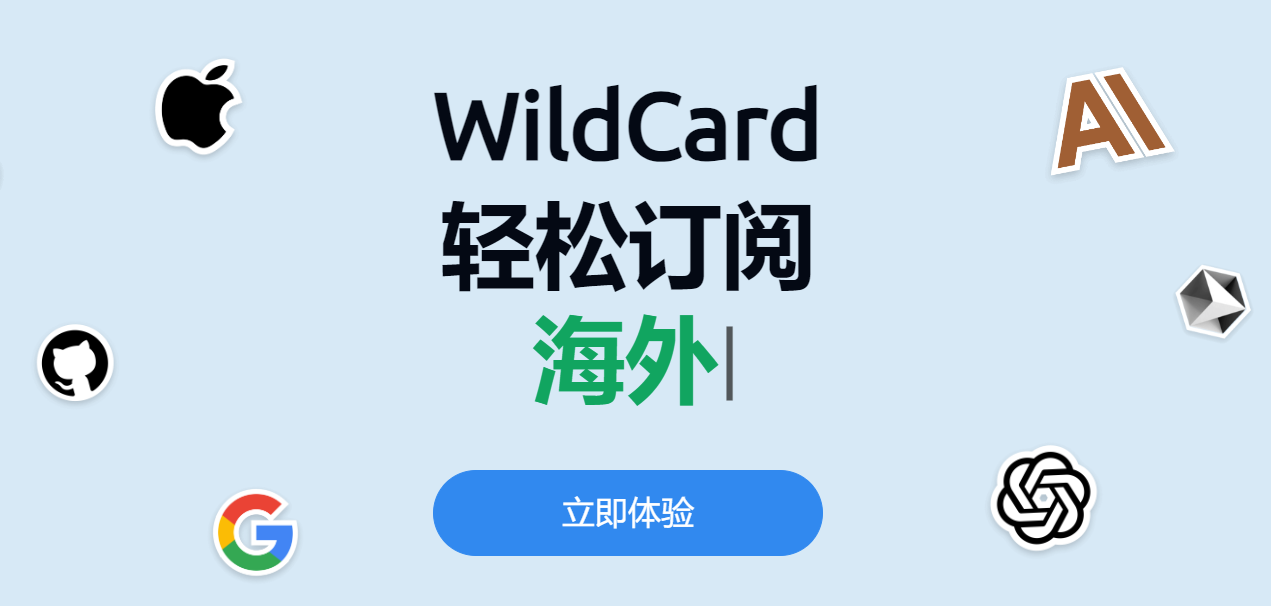 许多人可能已经注意到,国外的一些先进AI工具对国内用户并不开放。而想要使用这些工具,我们通常会面临两个主要障碍:一是网络访问的限制,二是支付问题。网络问题很容易解决,难的是如何解决在国内充值海外软件。今天给大家推荐一个工具——,用它能完美的解决这一问题。不仅可以充值订阅ChatGPT、Claude、Midjourney,还能充值Apple Store,Amazon,Adobe等等。是不是有点意思,下面就给大家分享wildcard的具体使用流程。