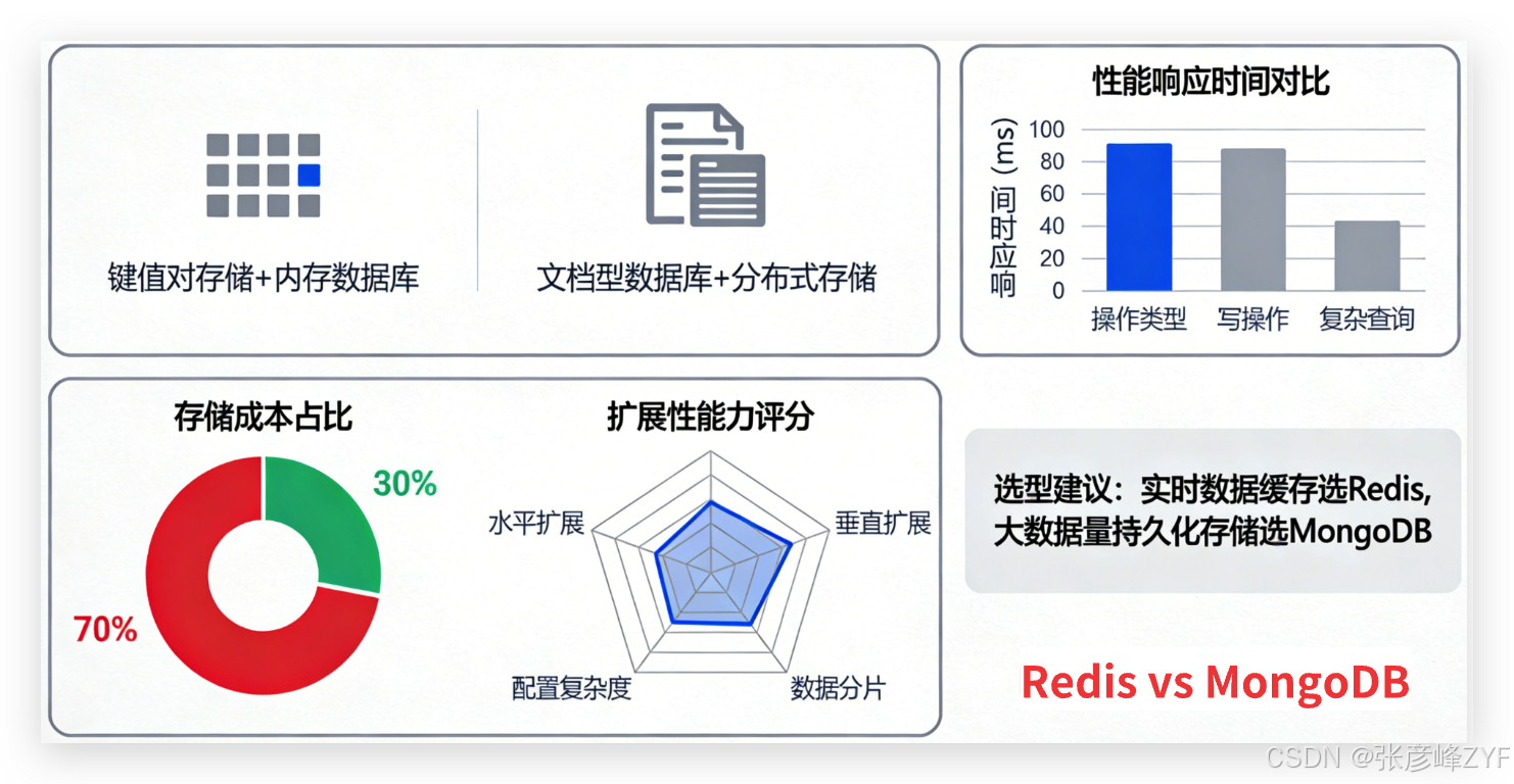 我们从架构、性能、成本、扩展性等多个维度对 Redis 与 MongoDB 进行深度对比,并给出最终选型策略。