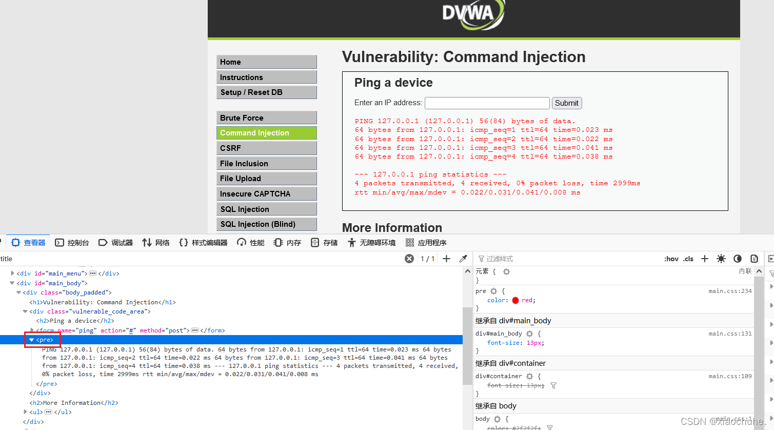 输入127.0.0.1命令,查看DVWA的command execute页面的源代码,如下图所示: