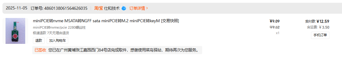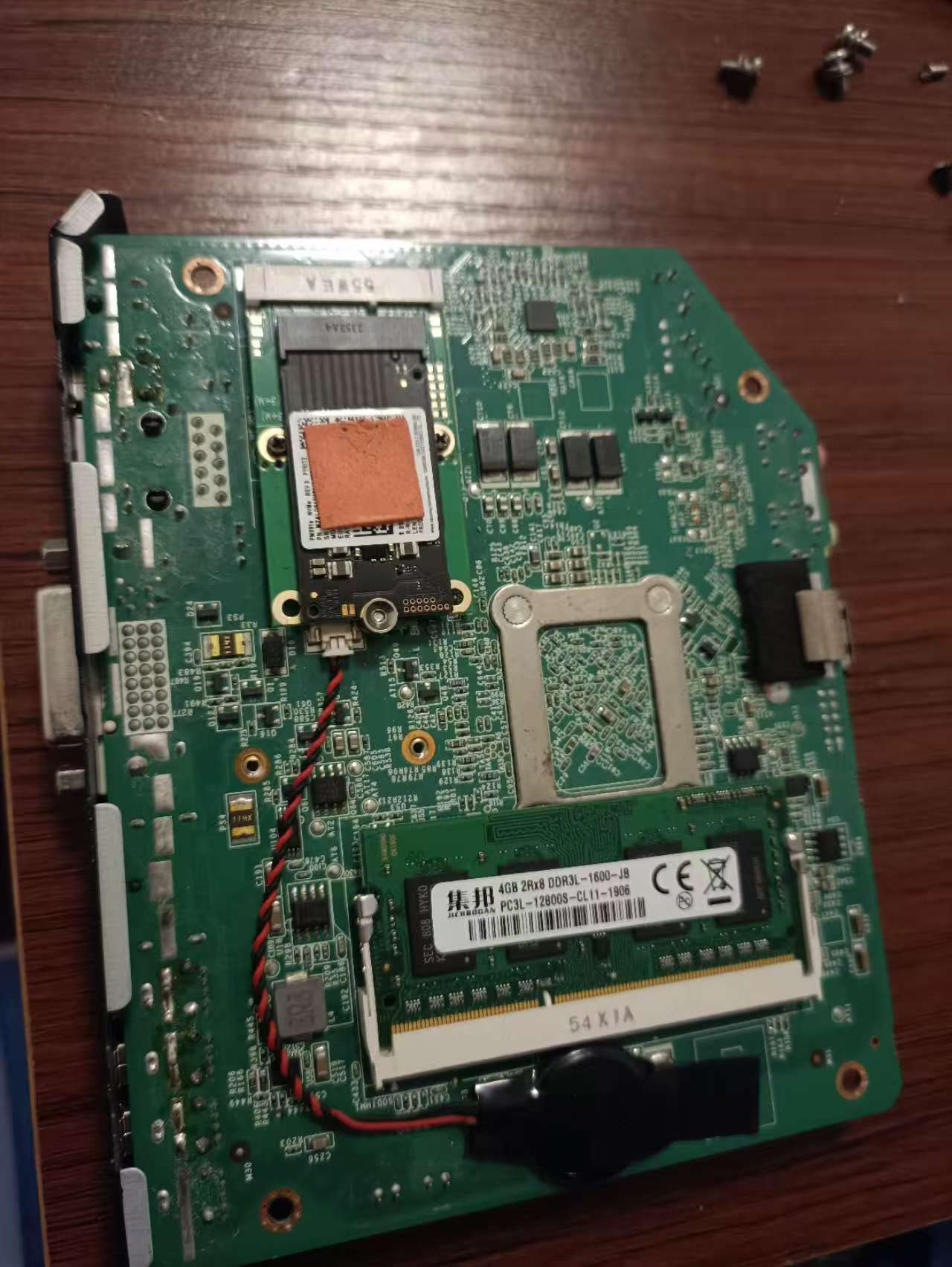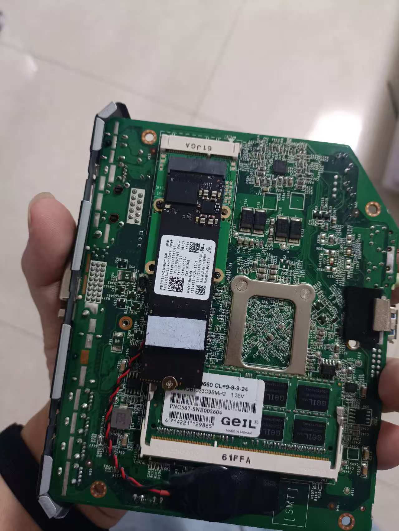正准备放弃时,我把主机拆开了,看到里面有一个MINIPCIE接口,正好手上也有两个512G的闲置NVME固态硬盘(???现在硬盘这么贵,这个硬盘可比这个主机值钱多了)。就想到上网买一个MINIPCIE转NVME的转接板,这样固态硬盘就可以当扩展的高速存储空间了。