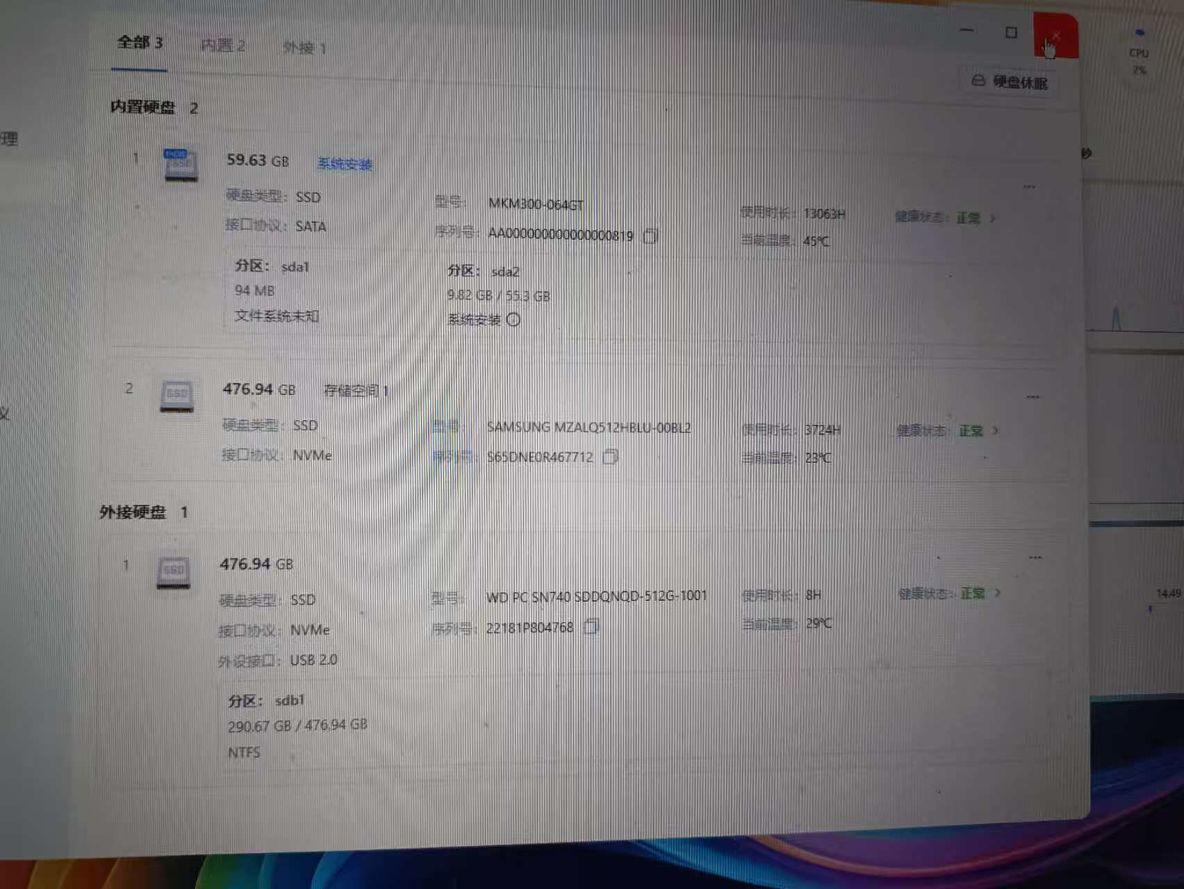 装完机后进入系统,再插USB的硬盘,现在显示三个硬盘了