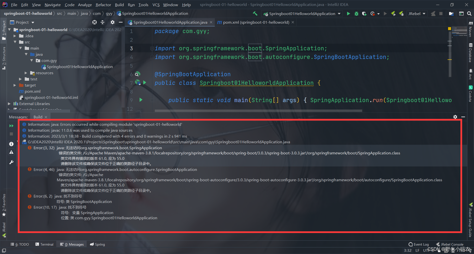 初来乍到,听说springboot很好用,很简便,于是爱搞事情的我就打算试试,因为最近在找工作,很多软件开发的也要求springboot的使用,于是我就开启了springboot的学习之旅,打算花几天高强度的把他给压下来,不能拖的太久。越拖就越不太能学得下来,但是,这springboot好像不太给面子,一开始就给我上了一课,还是费了一个小时才弄清楚原因,最开始按照视频教学,尝试启动第一个helloworld,但是构建完就出现了如下的错误: