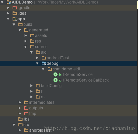 新建完毕aidl文件后,rebuild工程或者使用gradle assembleDebug(或gradle assembleRelease)指令编译工程,生成具体的java代码,在壳工程/build/generated/aidl/目录下的debug或者release文件夹下,根据build的类型而定,如图: